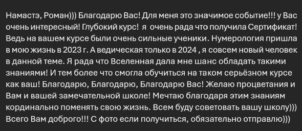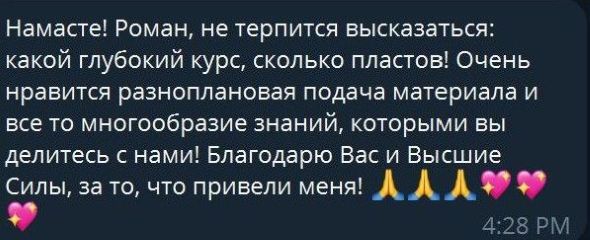 Намастэ🙏Роман, Ольга и все организаторы этого курса, а также все участники этого курса.🙏🌸 Хочу поблагодарить Романа за передачу знаний на уровне любви, энергий и внутренней радости🙏❤️