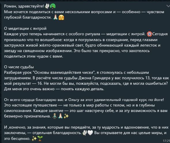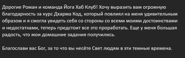 Также благодарю за медитации и курс йоги проведенные с Романом и Ольгой. За открытие новых дверей и знаний🙏❤️