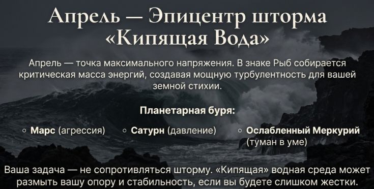 Квітень стане точкою максимальної напруги всім земних знаків. З’єднання Марса і Сатурна у знаку Риб створить потужну турбулентність — наче вода під вашими ногами раптом закипіла.