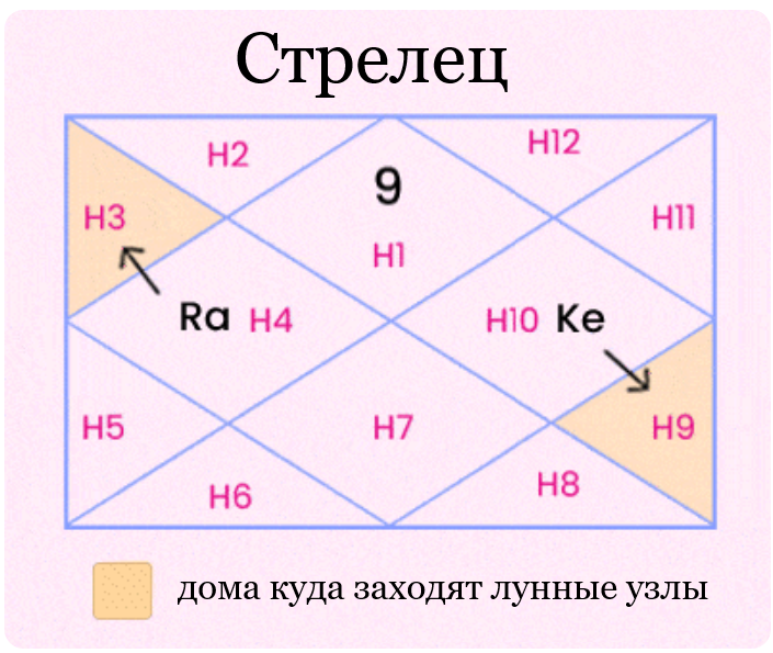 Два вузли (Північний та Південний вузол) (Раху та Кету) мають кармічне та духовне значення, що для Стрільців означає особливу відповідальність у питаннях передачі знань та духовного наставництва.