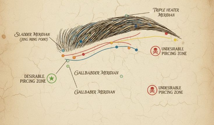 Брови знаходяться у священній зоні Аджна-чакри. У китайській медицині тут проходить меридіан сечового міхура. Металевий елемент поперек брови може створювати певний “енергетичний шум”, потенційно впливаючи на інтуїтивне сприйняття.