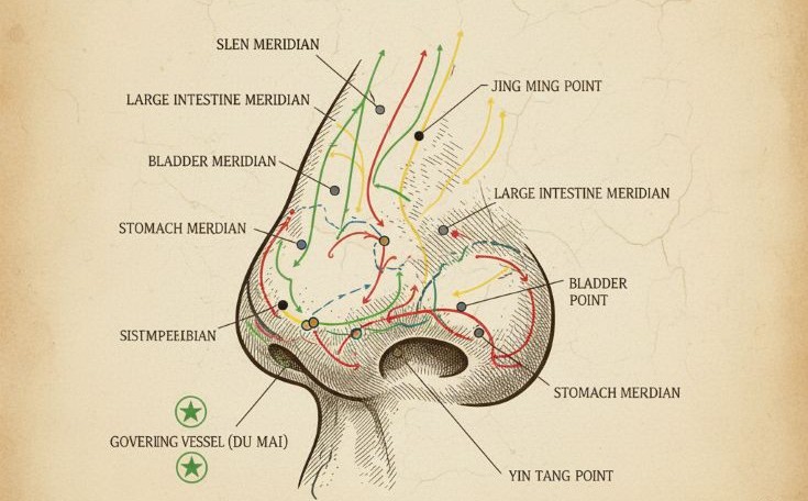 Носова перегородка (септум) — місце зустрічі Іда і Пінгала наді. Тут також проходить Ду-май (заднесерединний меридіан), що відповідає за всю Ян-енергію тіла. Метал у цій зоні може створити дисбаланс між потоками охолодження та зігрівання, що іноді впливає на практики пранаями, викликаючи головний біль або порушення сну через «перевантаження» енергією Ян у зоні голови.