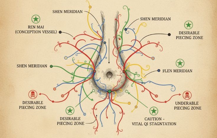 З погляду ТКМ: центральна лінія відповідає каналу Жень-Май (канал зачаття), що керує всією жіночою енергією тіла. Прокол може створювати енергетичну нестабільність і в довгостроковій перспективі впливати на Цзін (життєву есенцію) — базову енергію організму, від якої залежить наша життєвість і довголіття.