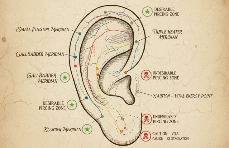 М’якуш вуха містить “очну точку”, і його проколювання традиційно вважається корисним для зору та активації мозкових функцій. Верхній край вуха (хелікс) відповідає печінці в системі Ян. Тут важливо розуміти — якщо робити пірсинг виключно заради краси, не враховуючи енергетичні особливості, це може вплинути на концентрацію уваги.