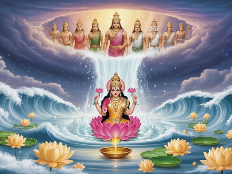 Согласно древним текстам, Варалакшми появилась из молочного океана во время великого пахтания, которое боги и демоны устроили ради получения нектара бессмертия. Представьте себе океан из молока цвета жемчуга, и из его глубин восходит прекрасная богиня в золотых одеждах — это и есть Варалакшми. Золотой цвет символизирует божественное изобилие, процветание и солнечную энергию жизни.